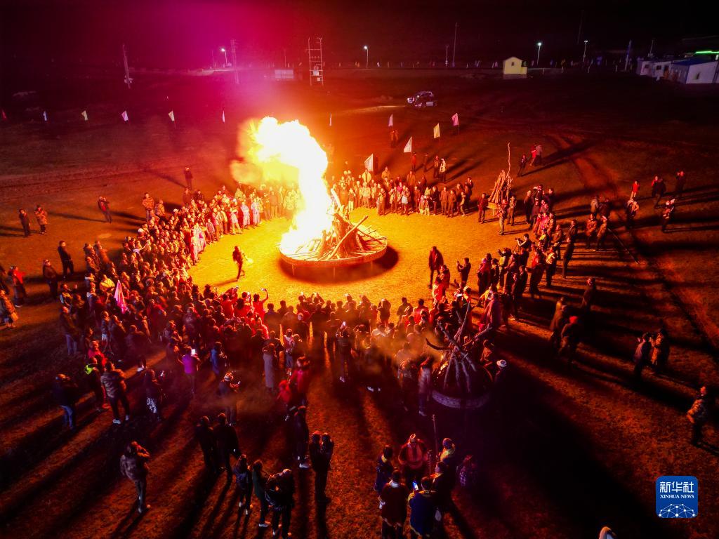 游客在新疆和田策勒縣板蘭格景區舉辦的一場(chǎng)篝火晚會(huì )上載歌載舞(5月30日攝,無(wú)人機照片)。
