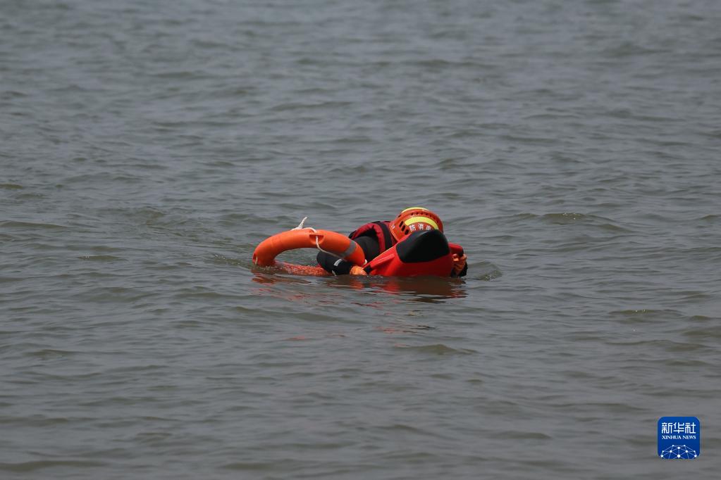 6月2日,在水域救援實(shí)戰演習現場(chǎng),一名模擬被困人員依靠智能水上救生遙控機器人回到岸邊。