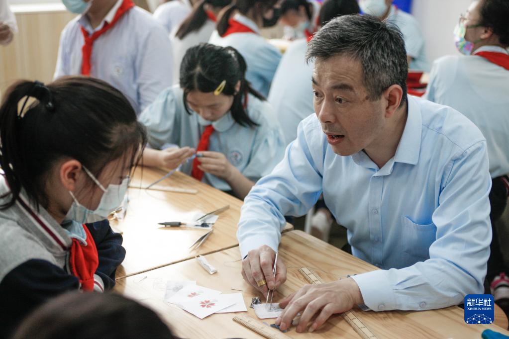 5月30日,江滿(mǎn)宗(右)在上海市青云中學(xué)教學(xué)生做盤(pán)扣。