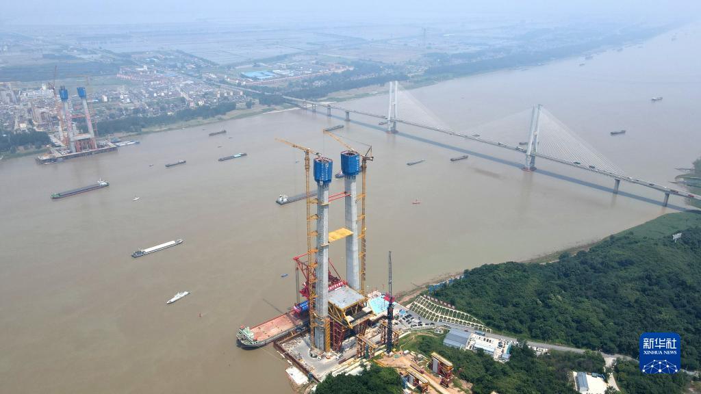 6月2日拍攝的封頂后的京臺高速銅陵長(cháng)江公鐵大橋4號主塔(畫(huà)面正中)(無(wú)人機照片)。