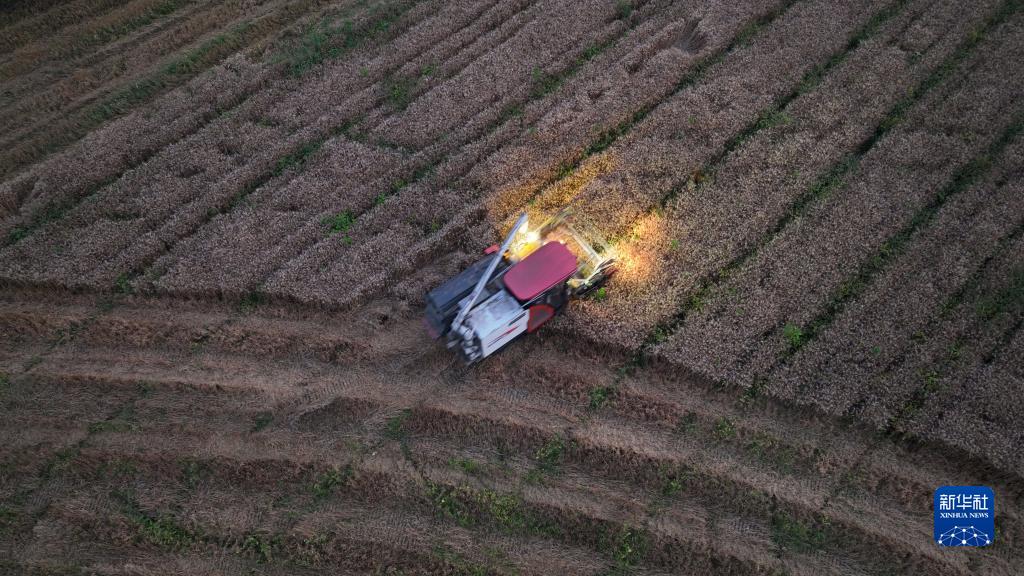 6月2日晚,農民在浙江省湖州市德清縣阜溪街道龍勝村駕駛農機收獲小麥(無(wú)人機照片)。