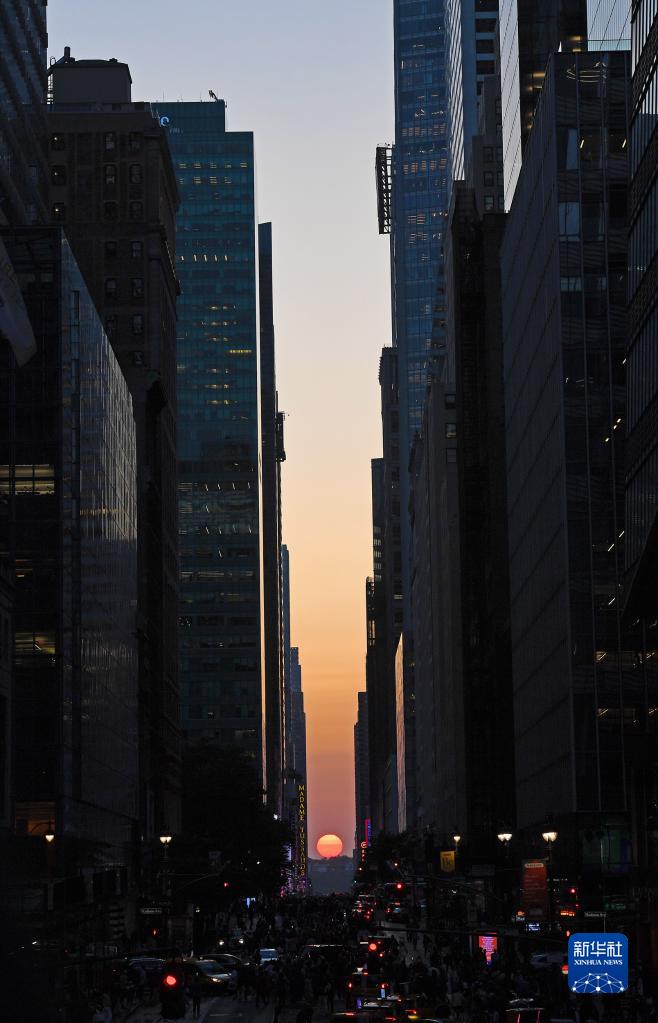 當日,紐約出現“曼哈頓懸日”景觀(guān)?!奥D懸日”是紐約市標志性景觀(guān),每年5月和7月出現兩次,指日落時(shí)太陽(yáng)正好出現在曼哈頓東西向街道正上方、似乎懸在兩側高樓大廈之間的戲劇性畫(huà)面。