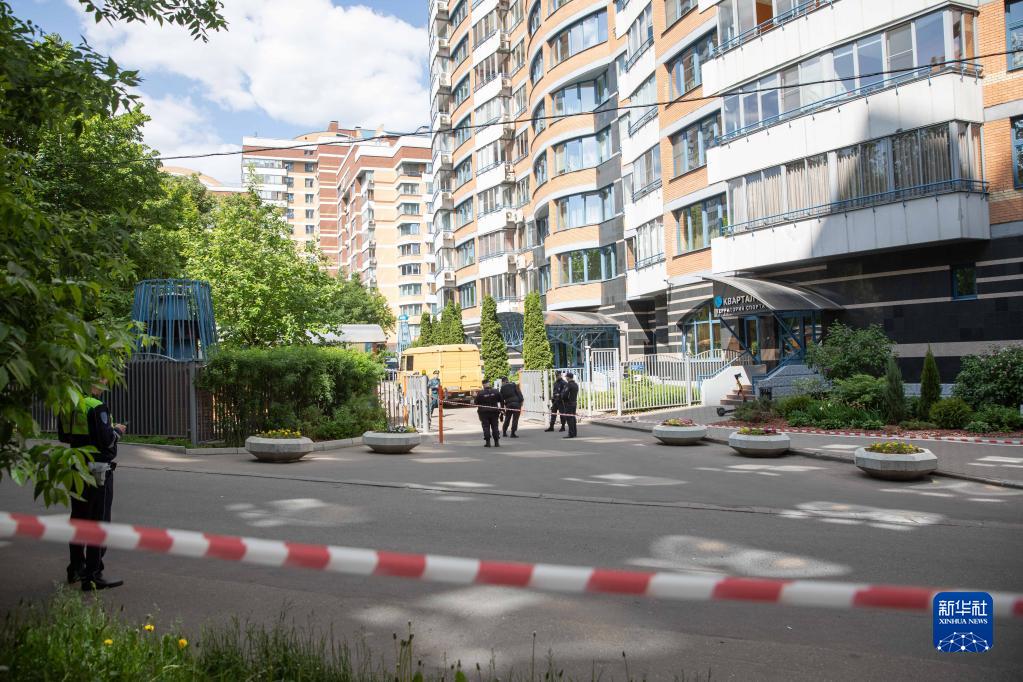 5月30日,警察在俄羅斯首都莫斯科的樓房遭襲現場(chǎng)警戒。