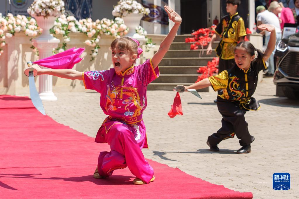 5月27日,小演員在烏茲別克斯坦首都塔什干的中央公園表演武術(shù)。