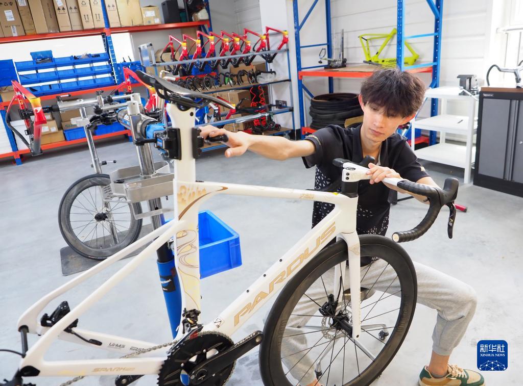 6月2日,在山東省樂(lè )陵市泰山瑞豹復合材料有限公司的碳纖維自行車(chē)生產(chǎn)車(chē)間,工人在檢測碳纖維自行車(chē)半成品。
