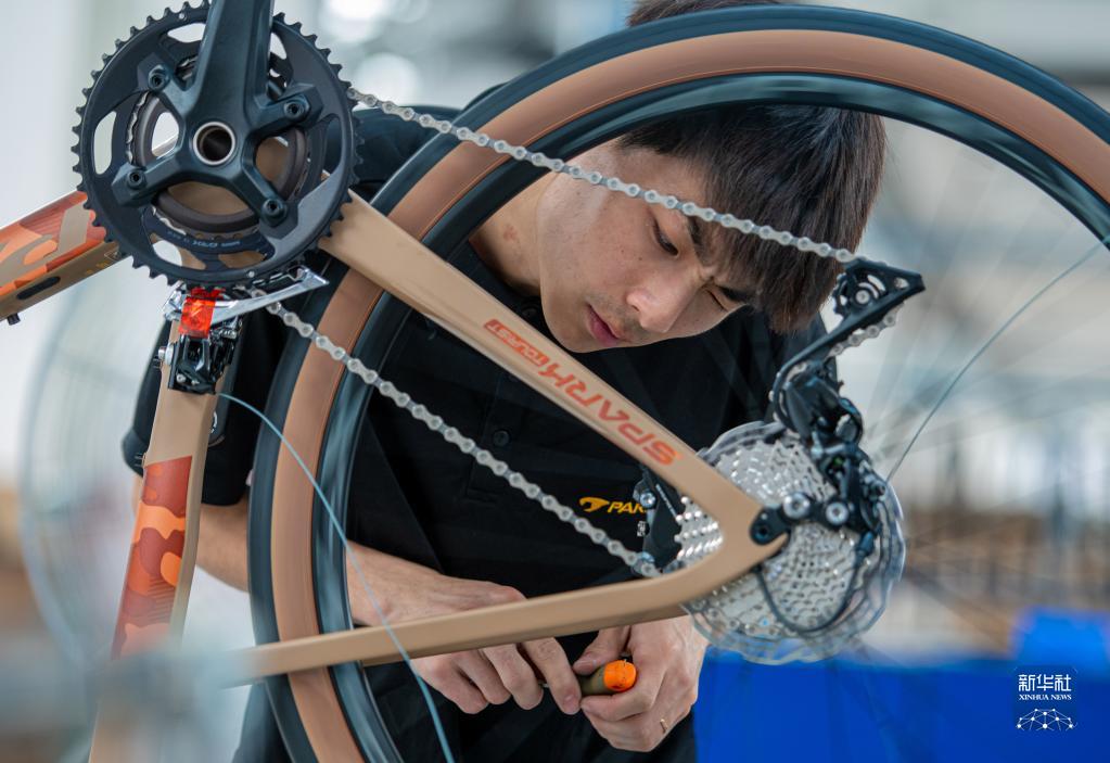 6月2日,在山東省樂(lè )陵市泰山瑞豹復合材料有限公司的碳纖維自行車(chē)生產(chǎn)車(chē)間,工人在裝配作業(yè)。