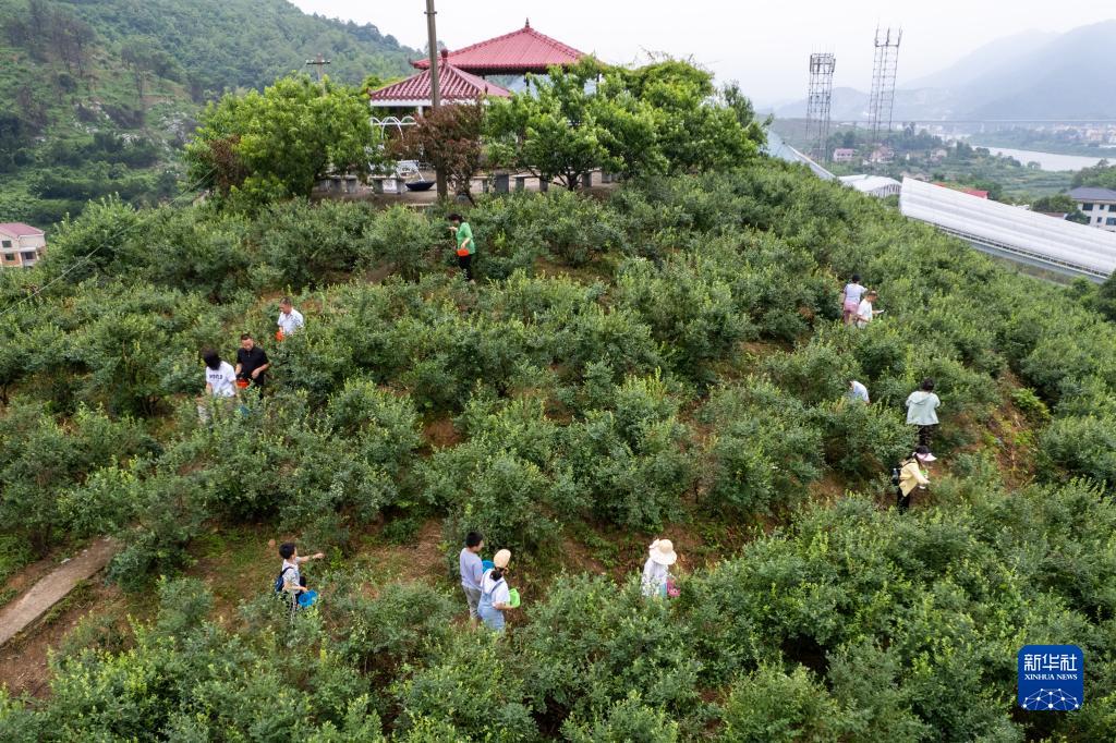 6月3日,在冷水江市金竹山鎮新田村藍莓基地,游客在采摘藍莓(無(wú)人機照片)。
