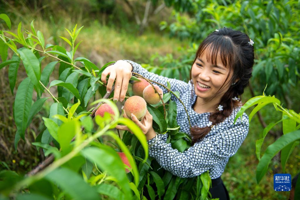 6月3日,在冷水江市鐸山鎮巖口村紅珠嶺鮮桃基地,游客在采摘桃子。