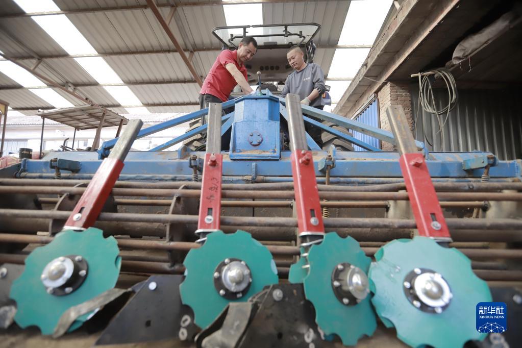 6月2日,在河北省唐山市豐潤區石各莊鎮一家農機專(zhuān)業(yè)合作社,農機手在檢修播種機。