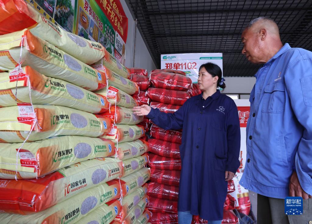 6月3日,河北省晉州市一家種子銷(xiāo)售站的工作人員(左)向采購種子的農民介紹玉米種子的特點(diǎn)。