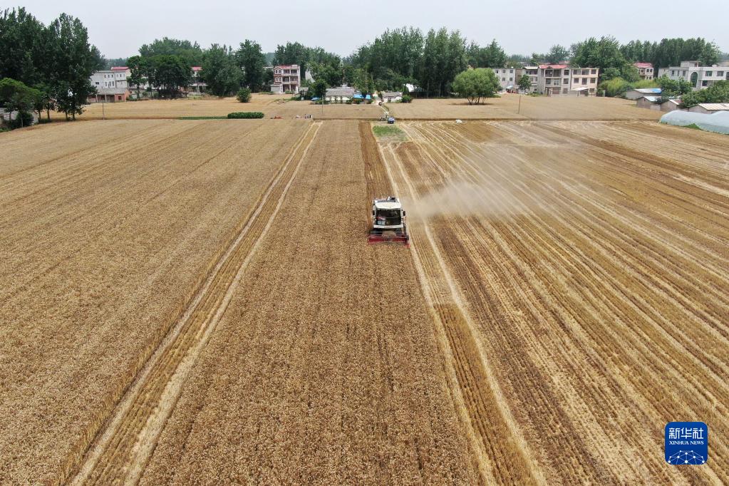 6月2日,在安徽省阜陽(yáng)市阜南縣許堂鄉劉崗村,董斐斐駕駛收割機為村民收割小麥(無(wú)人機照片)。