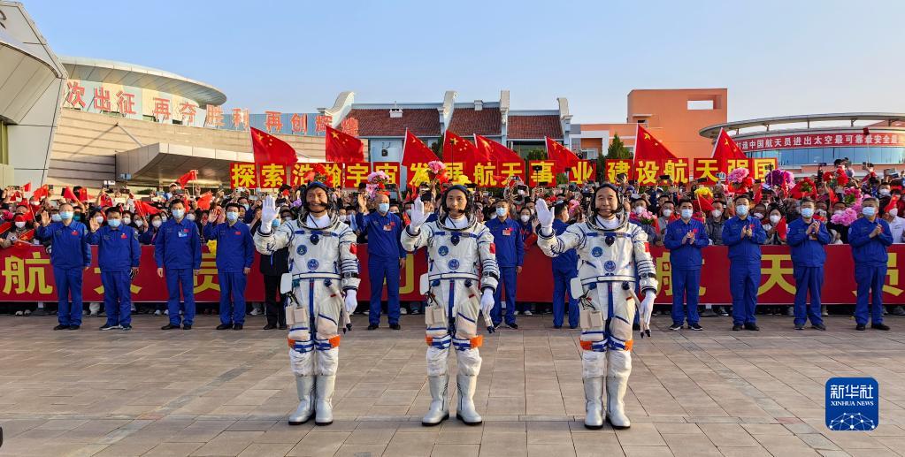 5月30日6時(shí)42分,神舟十六號載人飛行任務(wù)航天員乘組出征儀式在酒泉衛星發(fā)射中心問(wèn)天閣圓夢(mèng)園廣場(chǎng)舉行。這是航天員景海鵬(右)、朱楊柱(中)、桂海潮在出征儀式上。