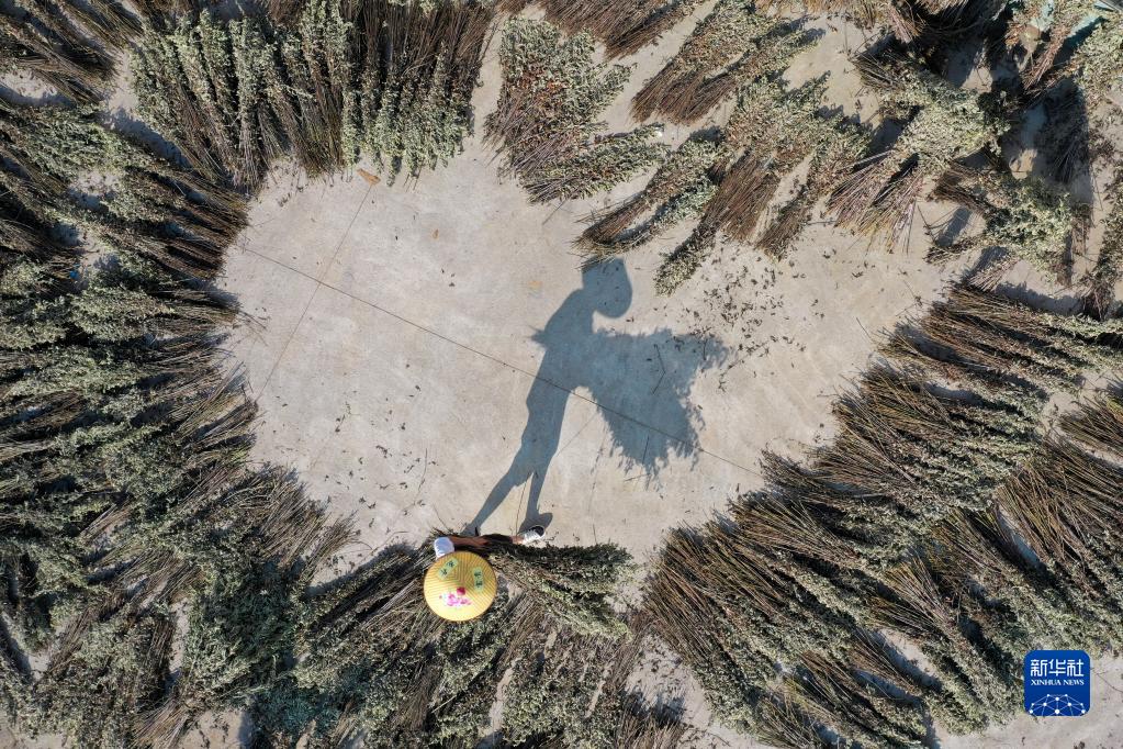 5月29日,在常寧市洋泉鎮西南村,農民在晾曬艾草(無(wú)人機照片)。
