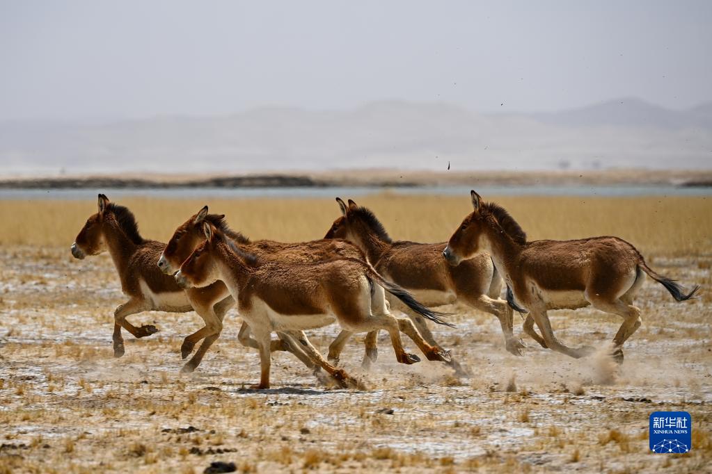 一群藏野驢在阿爾金山國家級自然保護區奔跑(5月23日攝)。