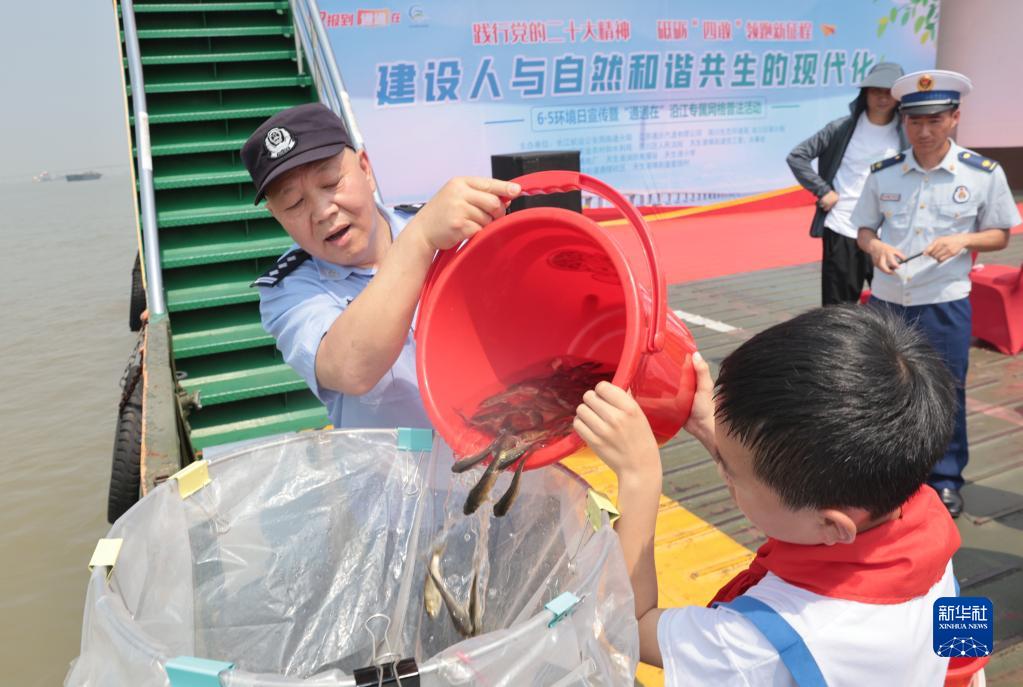 6月2日,在江蘇省南通市舉行的世界環(huán)境日宣傳活動(dòng)上,長(cháng)江航運公安局南通分局民警與天生港小學(xué)學(xué)生一起向長(cháng)江中放流魚(yú)苗。