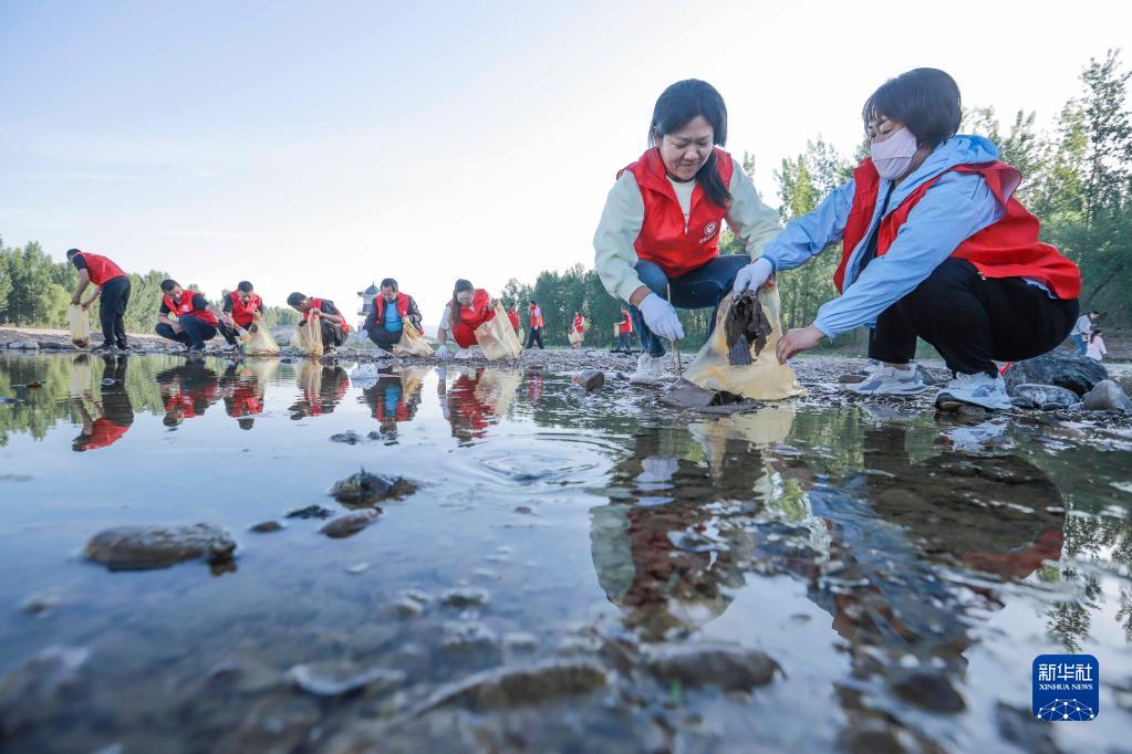 6月3日,在河北省唐山市遷西縣灤河濕地公園,志愿者在撿拾雜物。