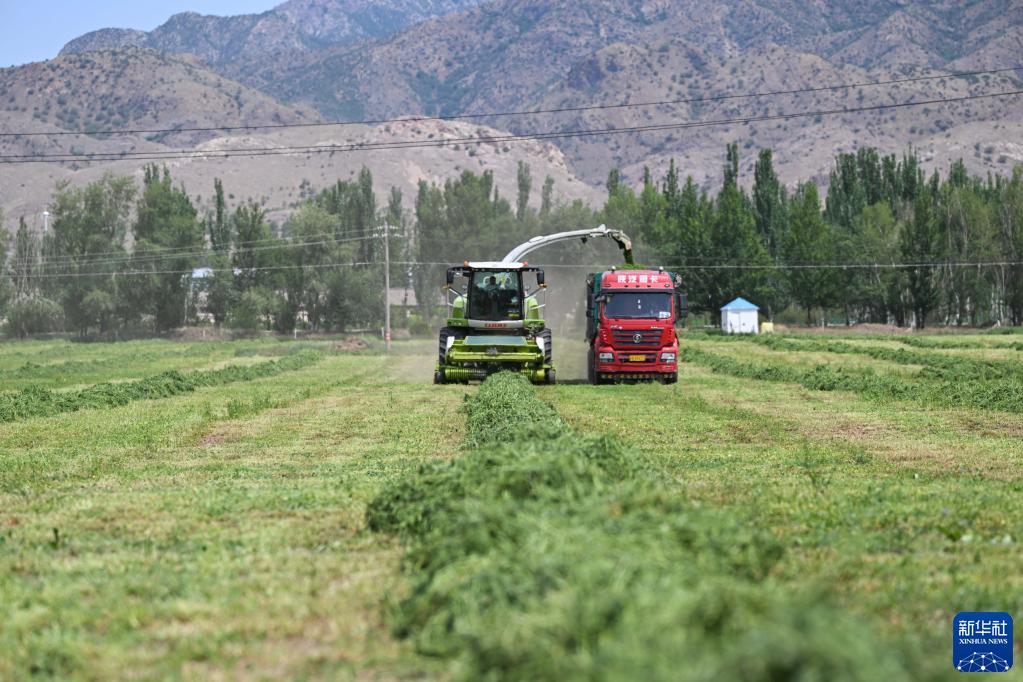 6月4日,在土默特左旗國家現代農業(yè)示范區內,機械車(chē)輛將苜蓿裝車(chē)。