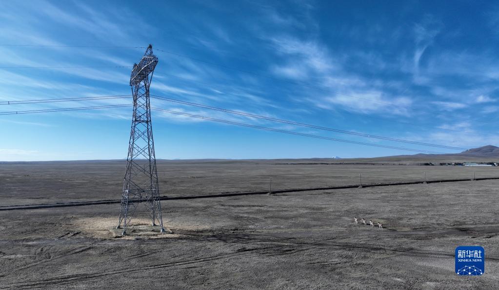 6月4日, 在青海省海西蒙古族藏族自治州格爾木市唐古拉山鎮境內,幾只藏野驢從青藏聯(lián)網(wǎng)工程輸電鐵塔前經(jīng)過(guò)(無(wú)人機照片)。