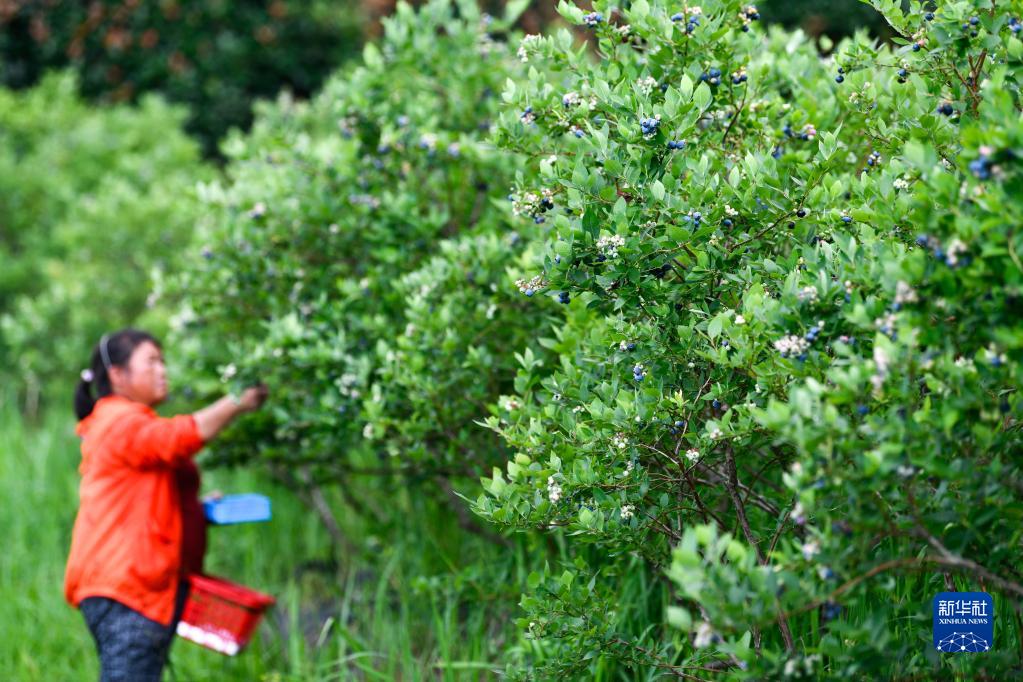 6月4日,村民在貴州省麻江縣藍夢(mèng)谷生態(tài)藍莓園采摘藍莓。