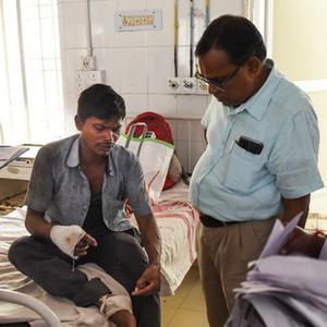 6月4日,列車(chē)脫軌相撞事故的傷者在印度奧迪沙邦巴拉索爾的一家醫院接受醫生檢查。