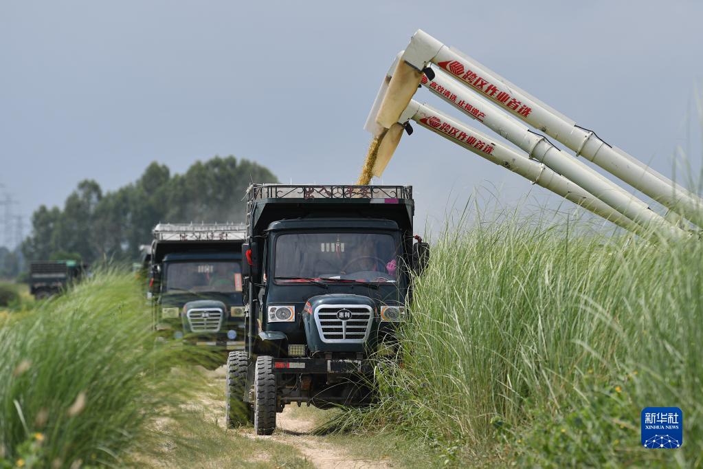6月4日,在位于海南省東方市的海南農樂(lè )南繁科技有限公司制種基地,農用車(chē)排隊等候轉運收割機剛收獲的稻種。