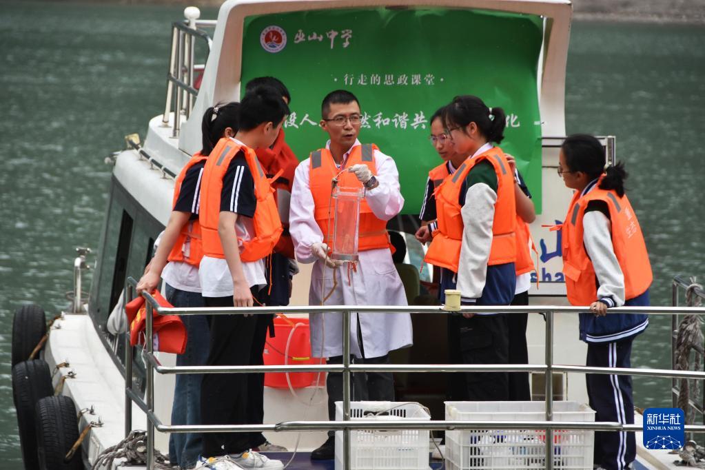 6月3日,重慶市巫山縣巫山中學(xué)的學(xué)生與巫山縣生態(tài)環(huán)境監測站的工作人員一起進(jìn)行長(cháng)江水質(zhì)監測取樣。