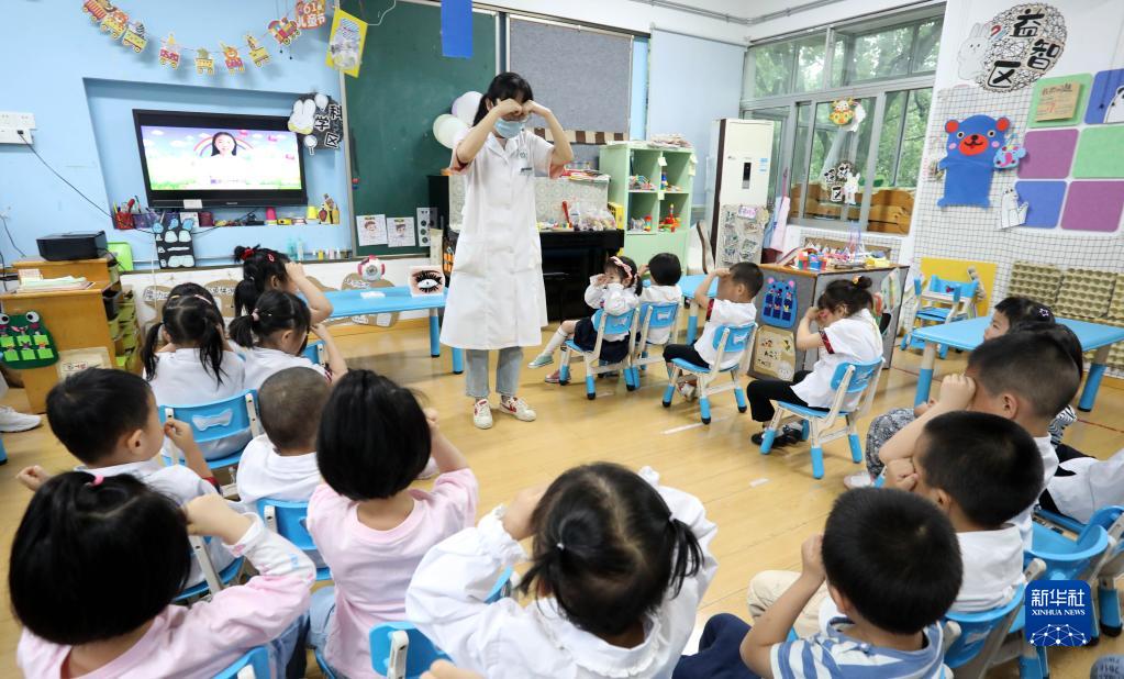 6月5日,江蘇省蘇州市姑蘇區金閶街道彩香一村社區衛生服務(wù)中心醫務(wù)人員指導彩香村幼兒園小朋友做眼保健操。