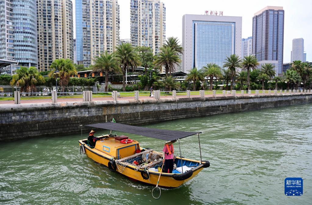 在廈門(mén)市廈鼓海域沿岸執行海面清潔任務(wù)的小型海漂垃圾保潔船(6月4日攝)。