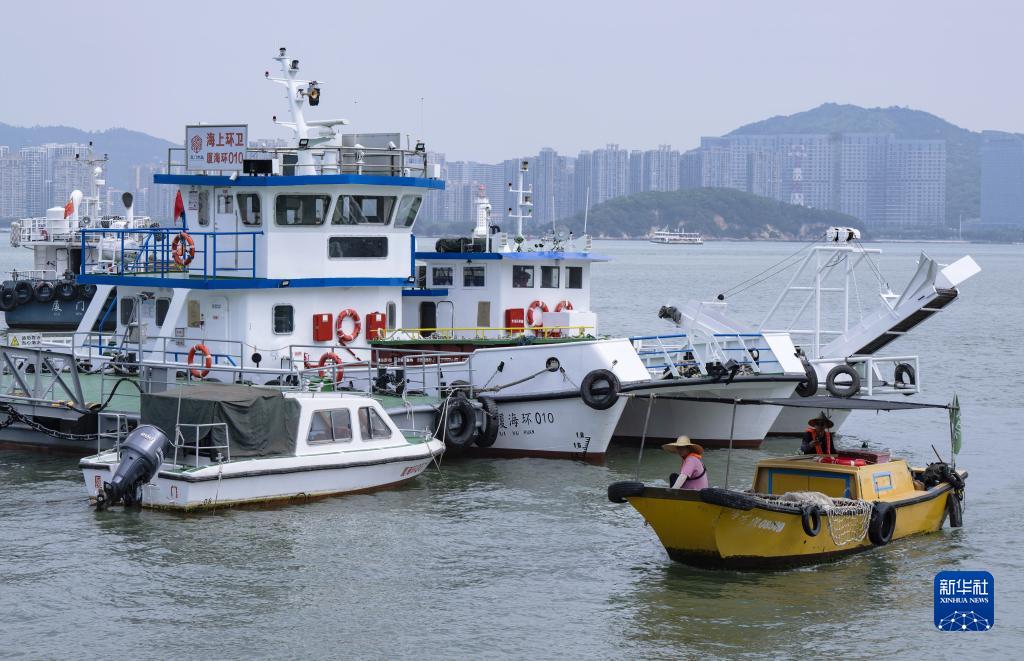 在廈門(mén)市西堤環(huán)衛碼頭,機械清掃船和小型保潔船舶準備執行海漂垃圾清掃任務(wù)(6月4日攝)。