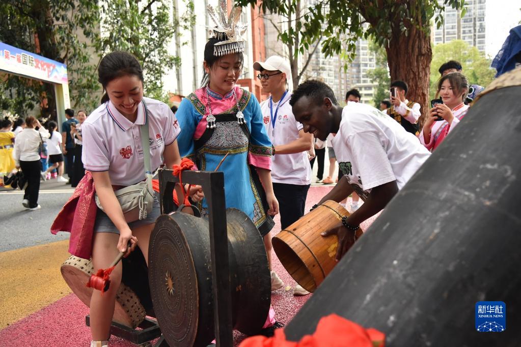 6月5日,參加三都高級中學(xué)第一屆國際文化節的來(lái)華留學(xué)生體驗敲擊銅鼓。