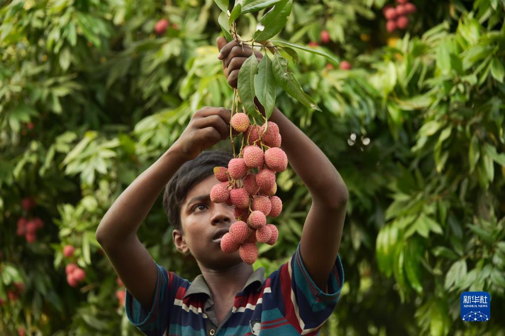 6月4日,一名男孩在孟加拉國迪納杰布爾的果園里采摘荔枝。