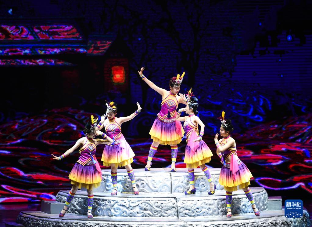 6月5日,演員在貴陽(yáng)大劇院的《多彩貴州風(fēng)》演出中表演節目《踩鼓舞》。