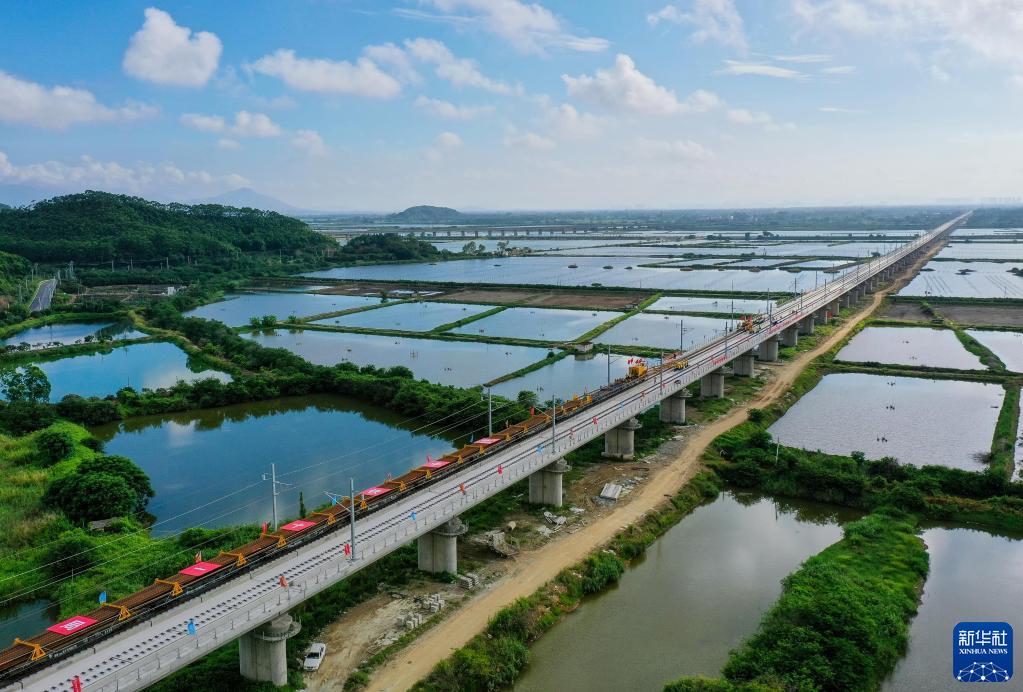 6月6日,中鐵十一局鋪軌機組在汕汕鐵路汕尾螺河特大橋上進(jìn)行鋪軌作業(yè)(無(wú)人機照片)。
