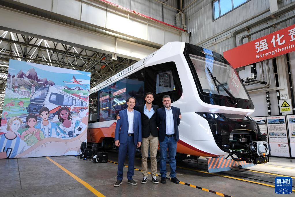 6月6日,阿根廷來(lái)賓在中國中車(chē)出口阿根廷新能源輕軌車(chē)輛首列車(chē)前拍照留念。