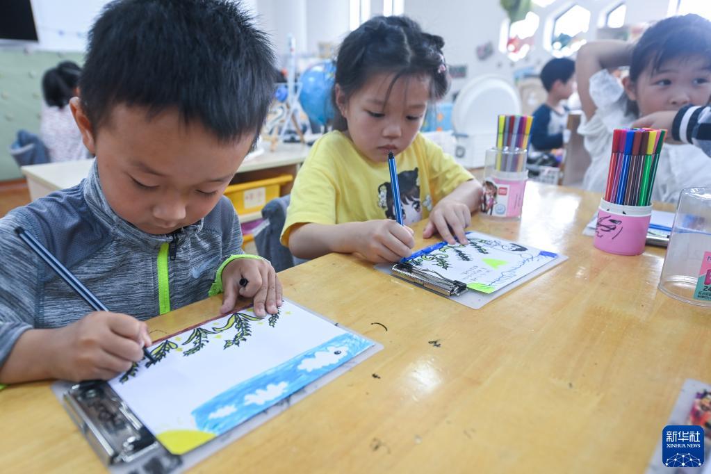 6月6日,孩子們在畫(huà)芒種主題畫(huà)。