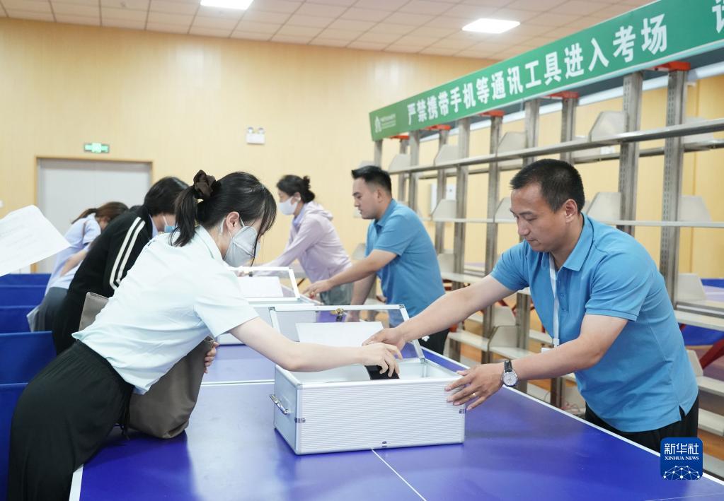 6月6日,在北京中國農業(yè)大學(xué)附屬中學(xué)考點(diǎn),考務(wù)人員進(jìn)行高考考前演練。