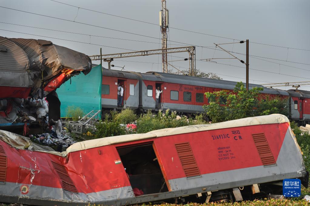 6月5日,在印度東部奧迪沙邦巴拉索爾地區,一列火車(chē)駛過(guò)列車(chē)相撞事故路段。