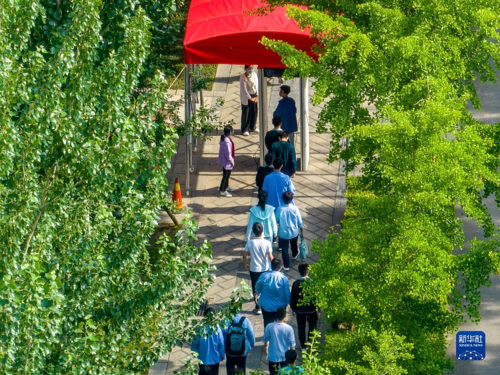 6月6日,河南省安陽(yáng)市考生在一考點(diǎn)排隊通過(guò)智能安檢門(mén)模擬入場(chǎng)(無(wú)人機照片)。