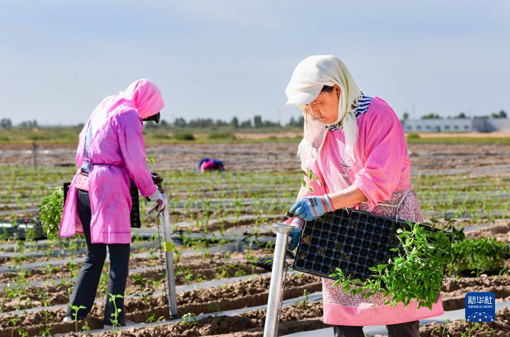 6月6日,農民在鄂托克前旗城川鎮麻黃套村的辣椒地里栽種辣椒苗。