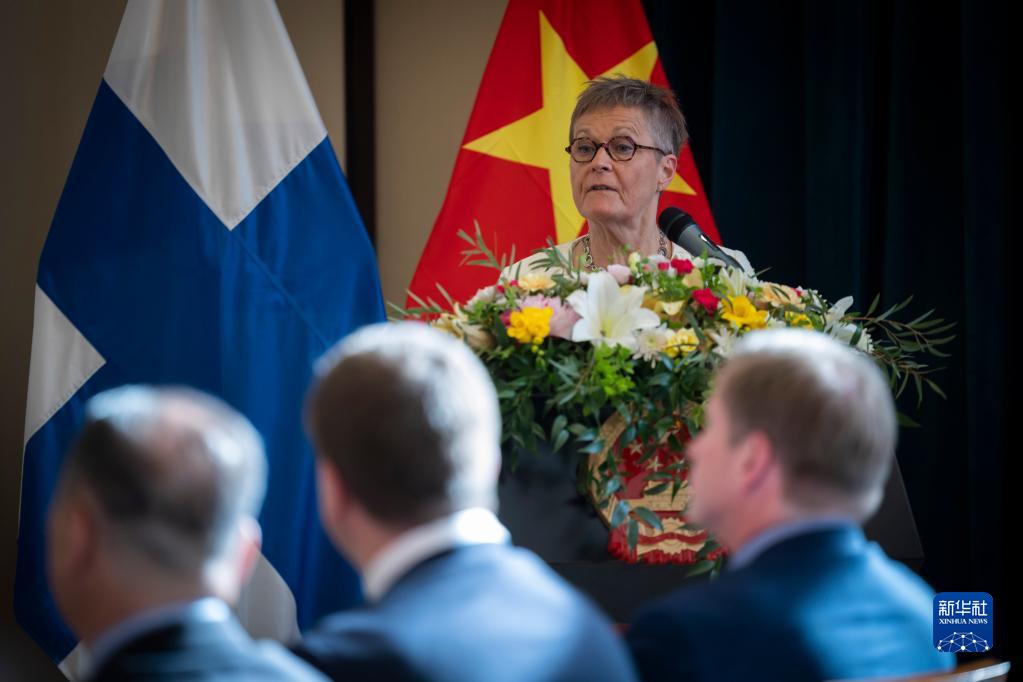 6月5日,芬蘭國家商務(wù)促進(jìn)局局長(cháng)尼娜·科波拉在芬蘭赫爾辛基舉辦的以“回顧中芬互利合作70年,攜手面向未來(lái)”為主題的研討與慶?;顒?dòng)現場(chǎng)發(fā)言。