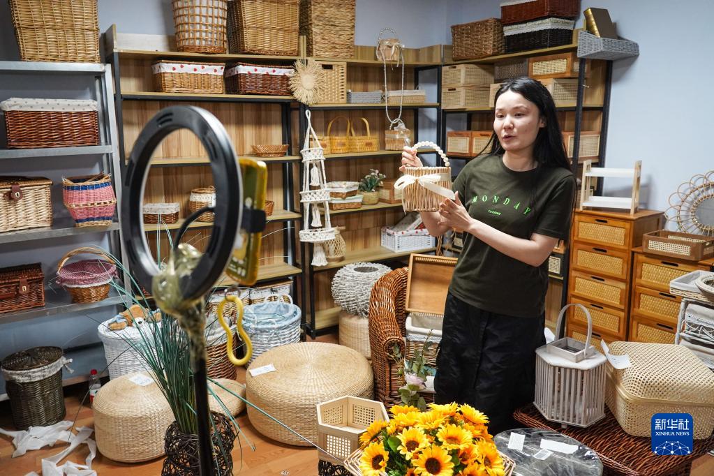 6月6日,臨沂金柳工藝品有限公司員工在電商平臺銷(xiāo)售柳編產(chǎn)品。