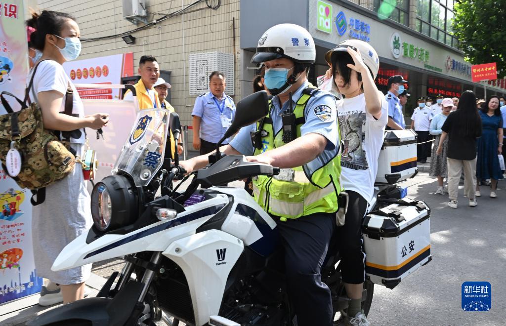 6月7日,在河南省鄭州市黃河科技學(xué)院附屬中學(xué)考點(diǎn),警察送考生趕赴她的考點(diǎn)。