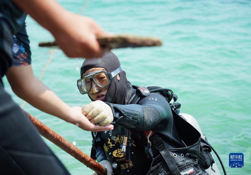 海南省三亞蜈支洲島海域海洋牧場(chǎng)是海南首個(gè)國家級海洋牧場(chǎng)示范區,蜈支洲島旅游區海洋部經(jīng)理王豐國作為海洋牧場(chǎng)建設的一線(xiàn)作業(yè)人員,致力于海域生態(tài)環(huán)境的修復和保護。他與海為伴,完成人工魚(yú)礁、船礁投放,珊瑚移植,協(xié)助科研機構調研等工作?!拔覀円彩撬虑宓婪颉?,清理海洋垃圾和珊瑚敵害,也是王豐國的日常工作。