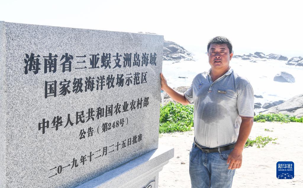 王豐國與海南省三亞蜈支洲島海域國家級海洋牧場(chǎng)示范區石碑合影(5月30日攝)。