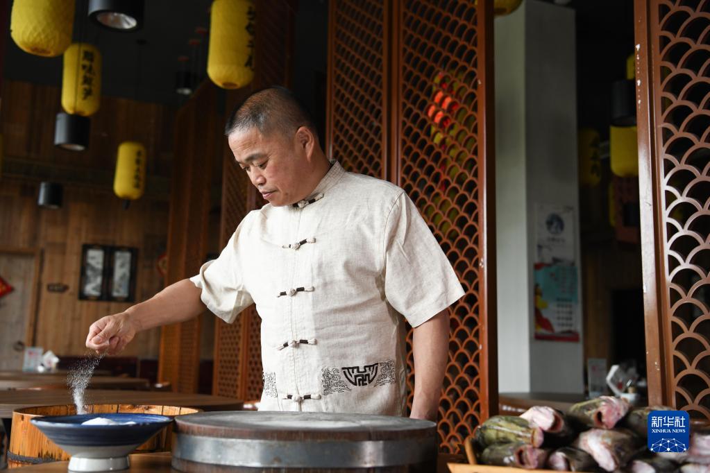 6月1日,在安徽省黃山市一家百年徽菜老店里,店主鐘少華在進(jìn)行臭鱖魚(yú)的腌制。他是徽州臭鱖魚(yú)制作技藝非遺傳承人。