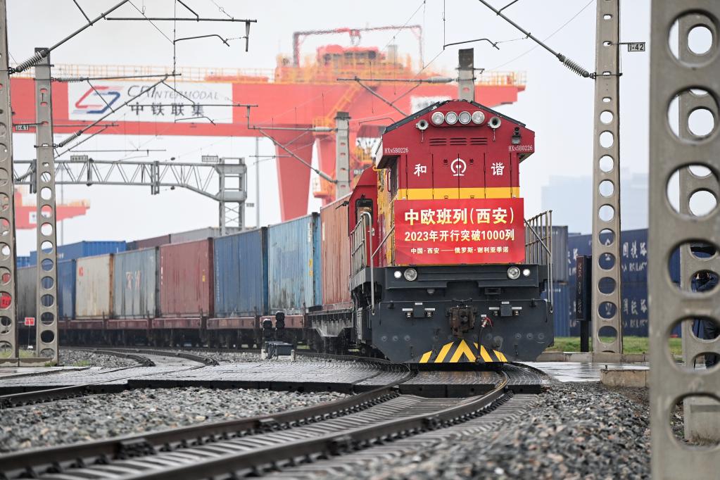 3月23日,X8489次中歐班列從西安國際港站駛出開(kāi)往俄羅斯謝利亞季諾。新華社記者 李一博 攝