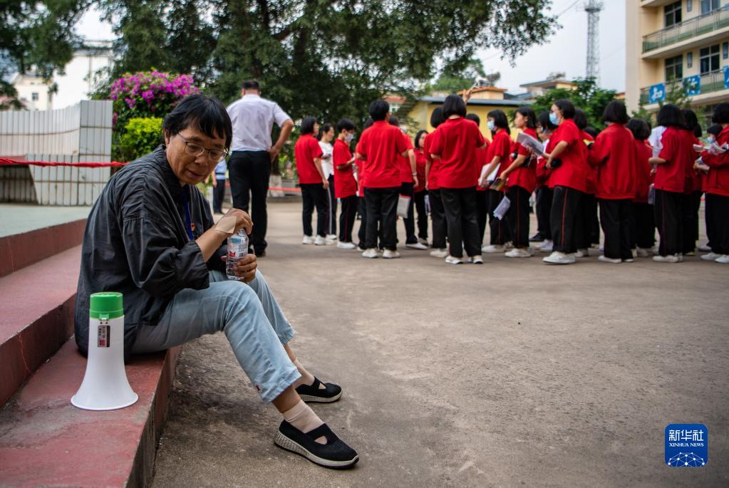 6月7日,張桂梅在考場(chǎng)外休息。