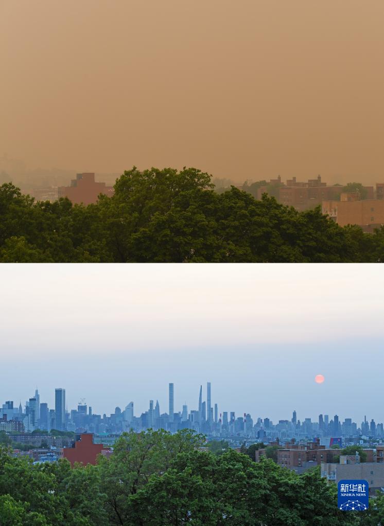 這張拼版照片顯示的是煙塵籠罩下的美國紐約(上圖,6月7日攝)和受煙塵影響前的紐約(下圖,5月21日攝)。