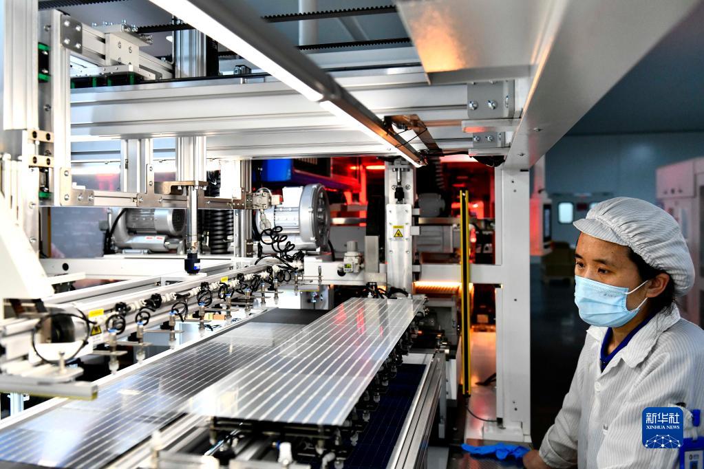 6月7日,在山東泉為新能源科技有限公司,工作人員在生產(chǎn)光伏組件。