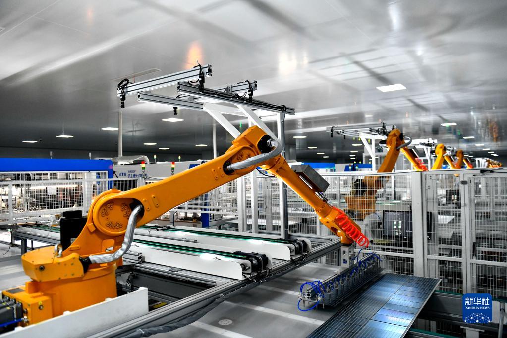 6月7日,在山東泉為新能源科技有限公司,工業(yè)機器人在生產(chǎn)光伏組件。